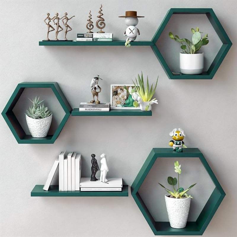 Wooden Floating Wall Shelves for Living Room, Wall Mounted Set of 6 Hexagon Shelves for Photos Plants and Wall Decor Honeycomb