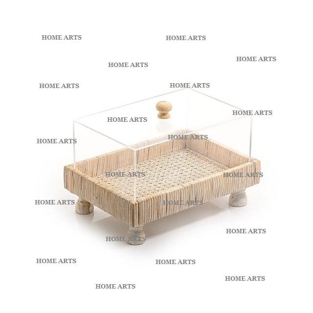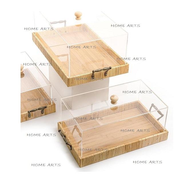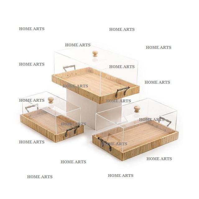 Wooden Food Serving Tray With Iron Handles And Acrylic Lid Set of 3 Different Sizes Dessert Dates Tray By Home Arts