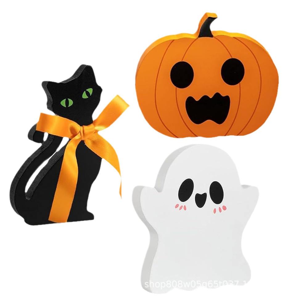 Wooden Halloween Sign Set 3Pc Cat Pumpkin Ghost Decor Indoor Outdoor Craft Props For Halloween Party Decoration