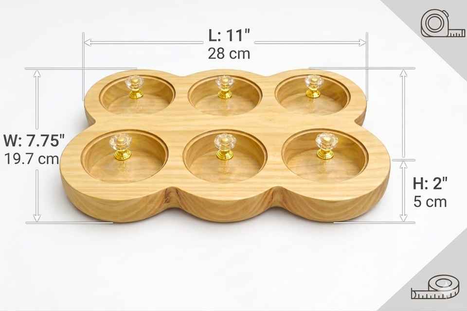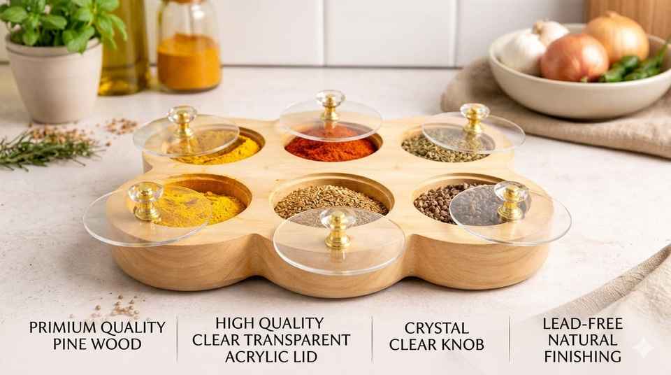 Wooden Handcrafted Rectangular Spice Box Masala Dabba Acrylic Lid with 6 Round Compartments Food Safe Pine Wood Spice Box Set