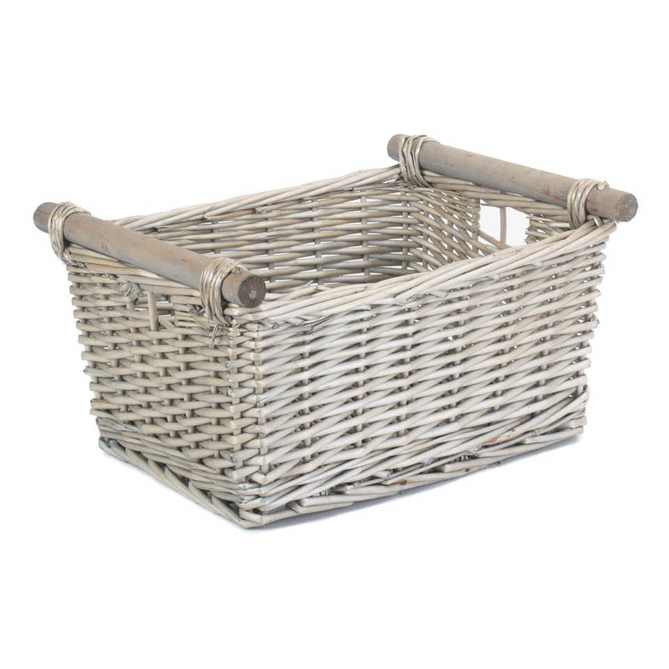 Wooden Handle Gray Washed Woven Basket Panier De Rangement En Osier with Stylish Design