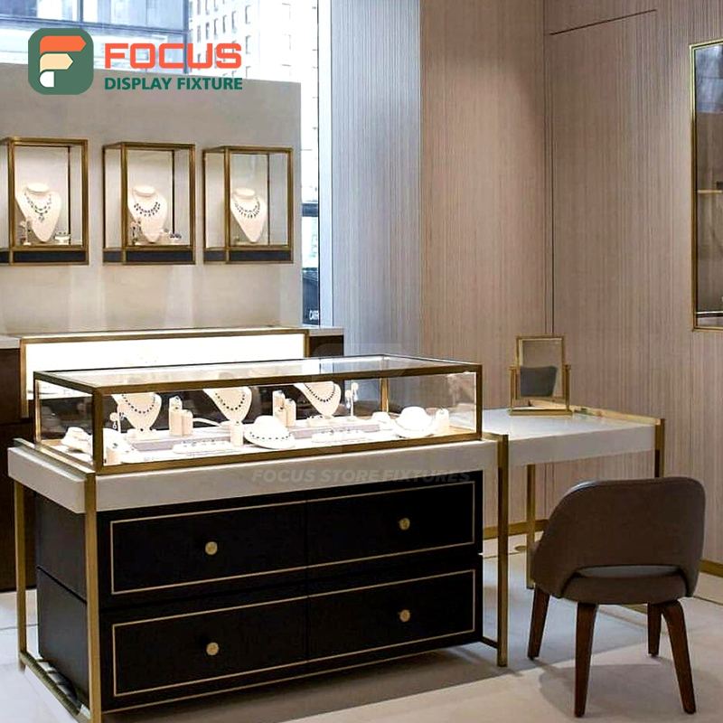 Wooden Jewelry Counter Glass Display Cabinet Luxury Jewelry Display Cabinet High End LED Light Display Unit