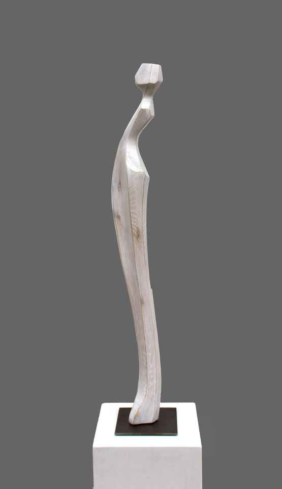 Wooden Lady Standing Sculpture White Color Finished Cube Shaped Metal Base Artistic Handmade Decorative Accent Home Decor