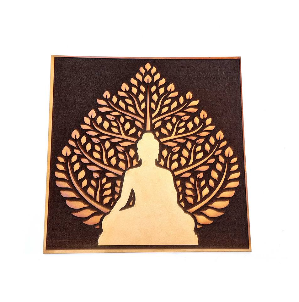 Wooden MDF Buddha Statue Engraved Laser Cut CNC Cut Etched Scenery Meditating Buddha Under Tree Leaves Decorative Religious Wall
