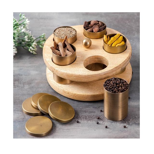 Bulk Wooden Masala Box Dabba For Kitchen Spice Jars Containers Kitchen Accessories Metal 5 Jars With Gold Lid