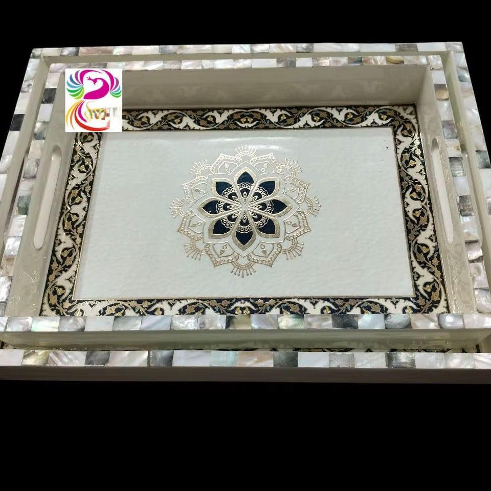 Wooden Meena Design Wooden Accent Coffee Tray Stylish Serving Tray with mother of pearl work done gold foil print