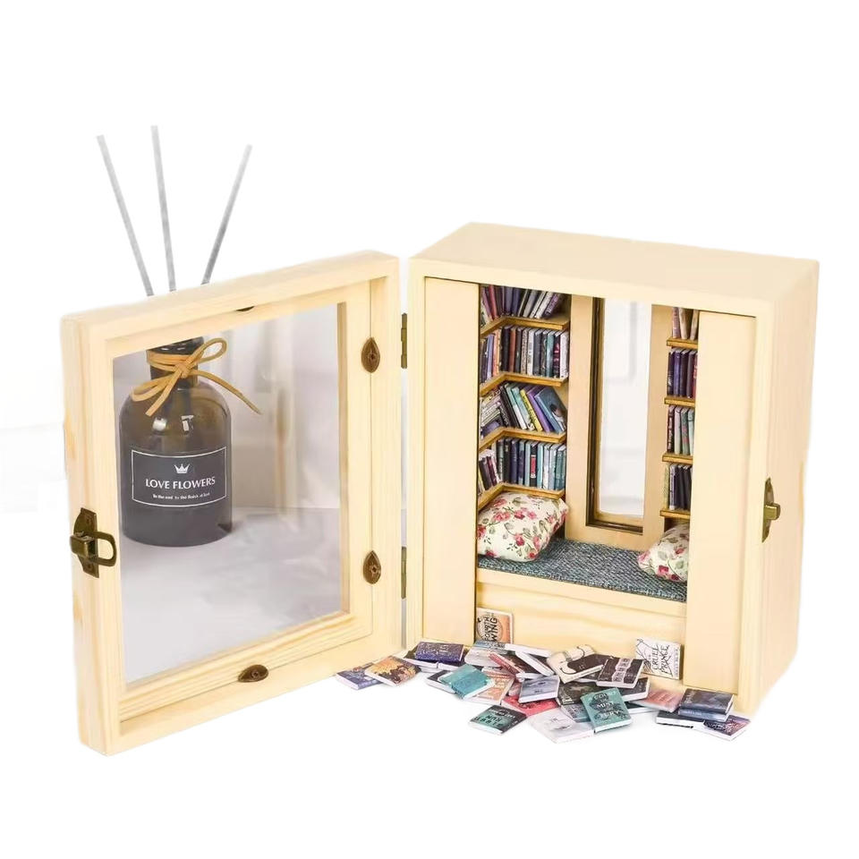 Wooden Mini Bookshelf Desktop Library Model Ornament Natural Wood Color Storage Box With Mirror And Cushion Seat