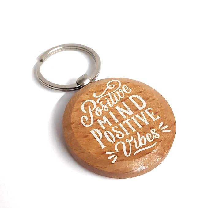 Wooden Motivational Quote Keyring Think Positive Engraved Round Keychain for Men Women Car Bike Home