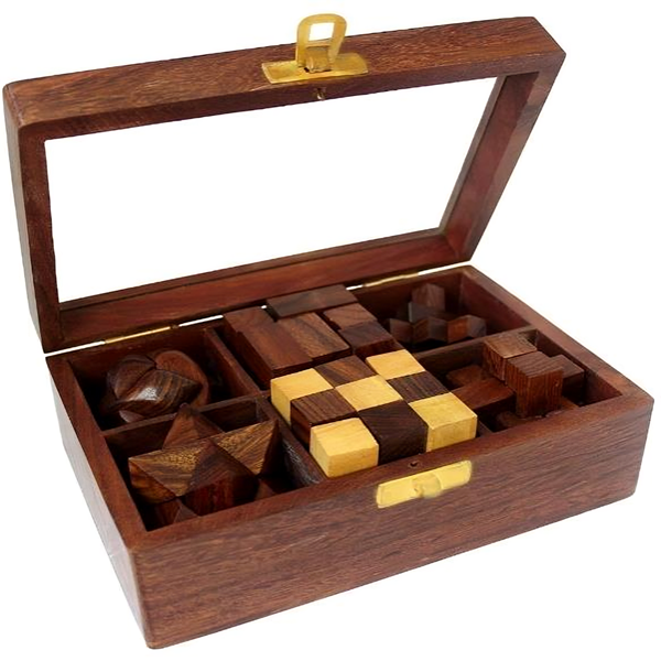 Wooden Puzzle Set with Glass Lid 9 Brain Teasers in Handcrafted Box for Kids and Adults | Classic Logic Puzzle Collection