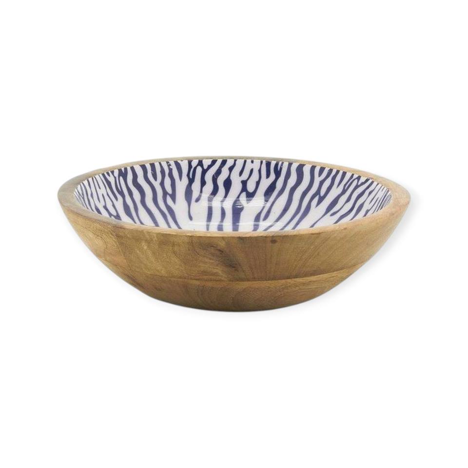 Wooden Serving Bowl with Blue Zebra Stripe Enamel Pattern for Modern Kitchen and Contemporary Dining Use
