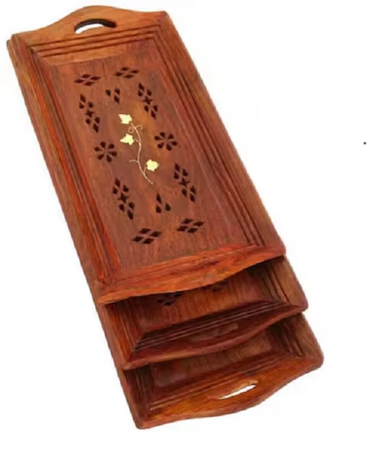 Wooden Serving Coffee Tray Set of 3 with Brass Work Home Decor and Kitchen Decor One Small One Medium and One Large Tea Try