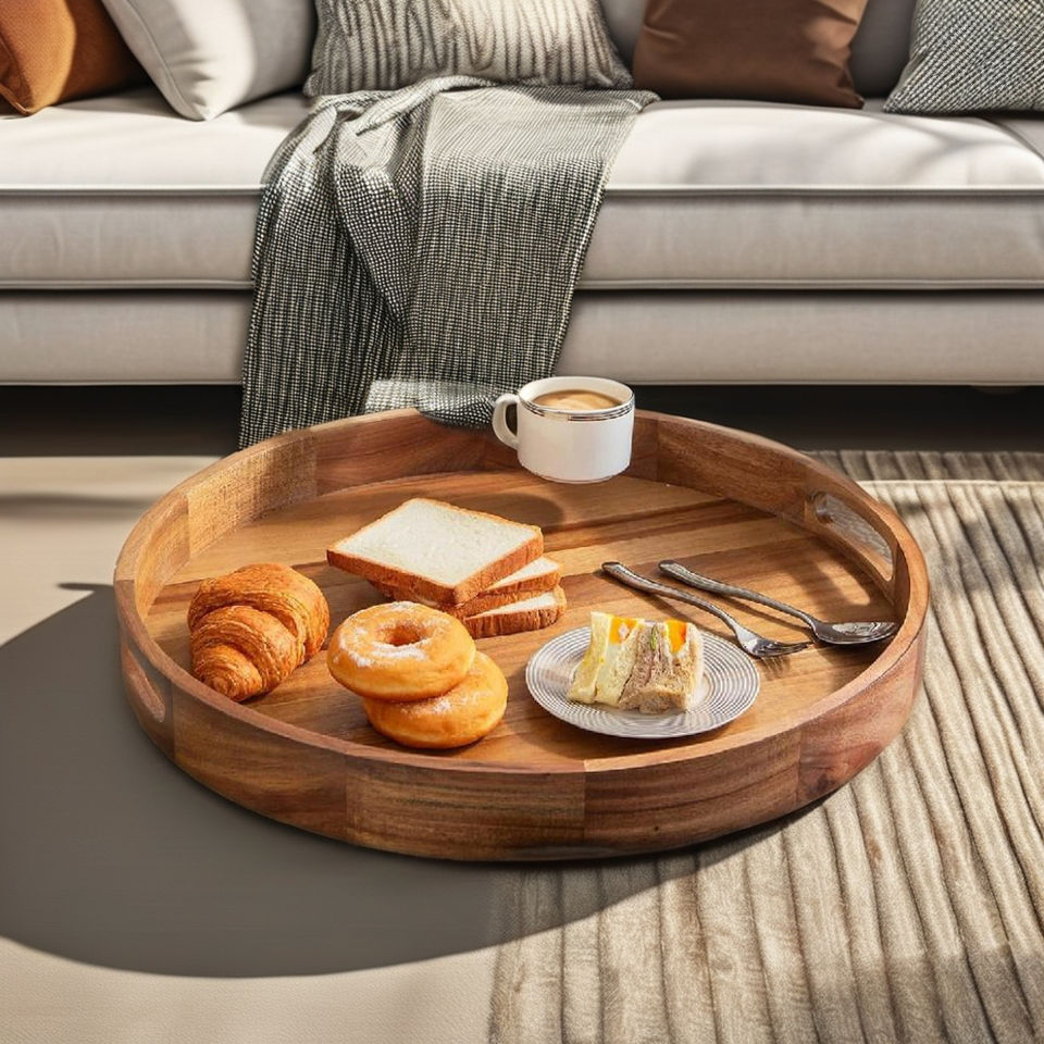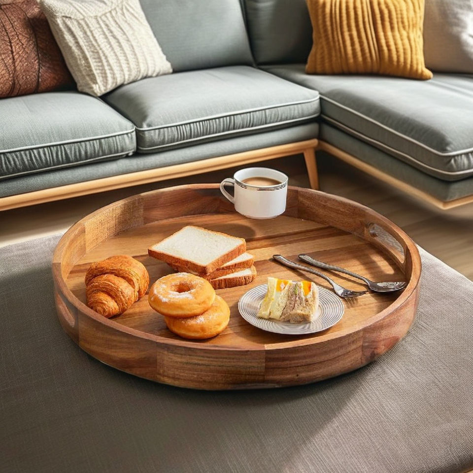 Wooden Serving Tray with Handles 22 Inch Extra Large Round Ottoman Tray Acacia Large Wood Trays Ottoman Living Room Wooden Trays