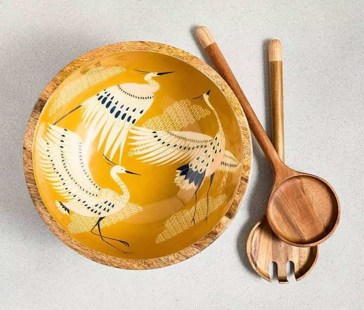 Sustainable Wooden Small Salad Bowl and Plate Set Handicrafts Printed Enamel Fruit Home Decor Wedding Use Contemporary Gifting