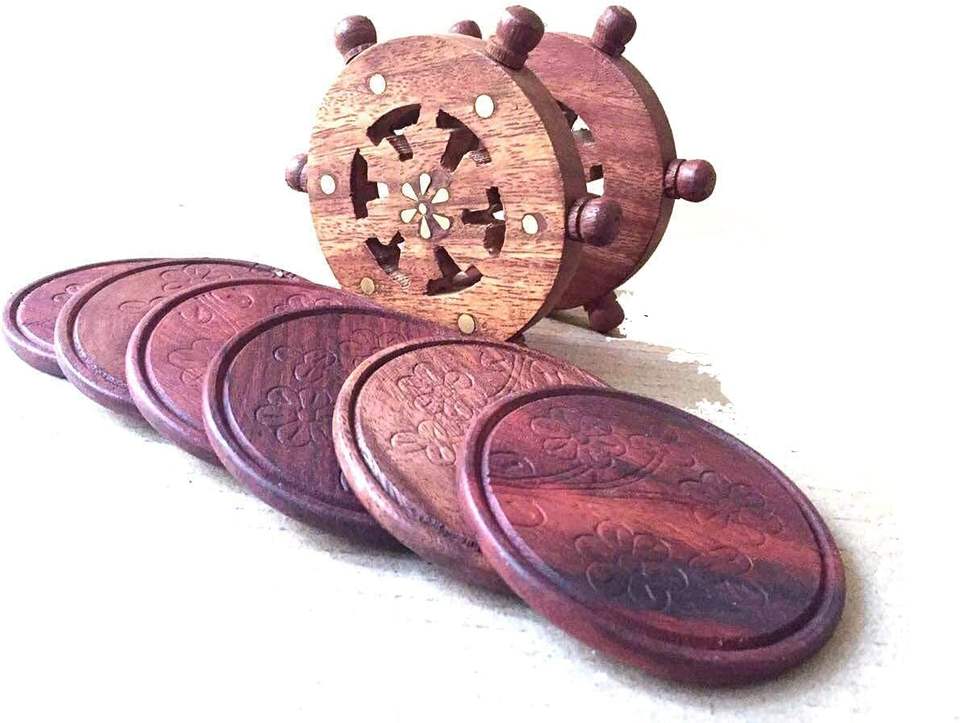 Wooden Tea Coaster Wheel Shape Designed (Brown) 4 inch for Kitchen & Dining Table