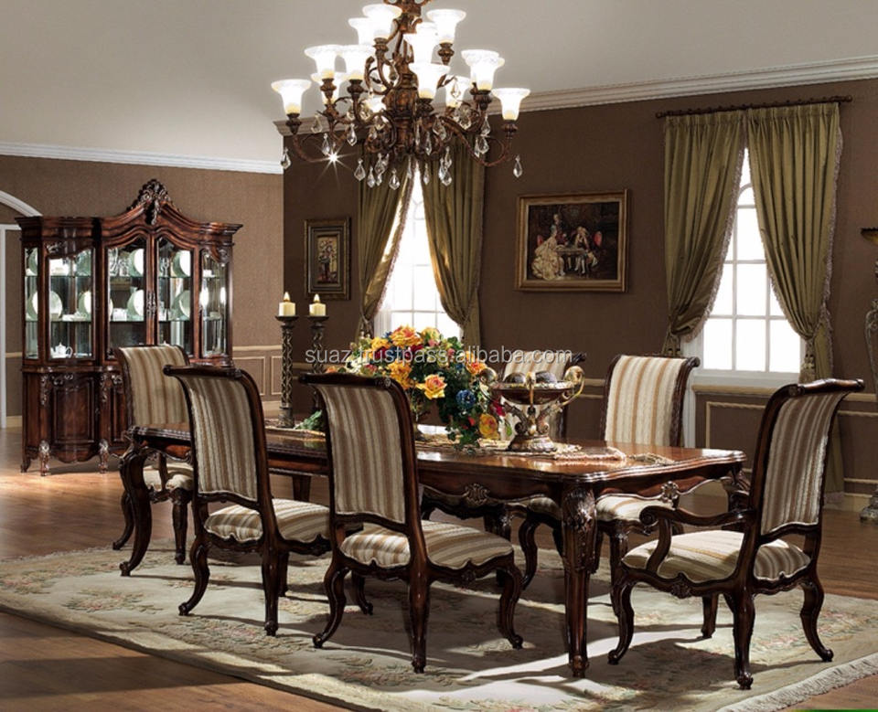 Wooden Traditional Indian Dining Table , Dining Room Furniture , Carved Brown Antique Wooden Carved Round Dining Table Chairs