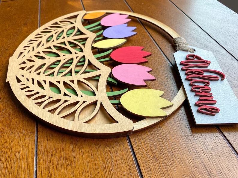 Wooden Tulip Basket Shaped Wall Door Sign, Handmade Design Sign for Home Decoration.
