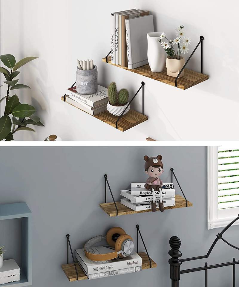 Wooden Wall Shelf for Living Room Metallic Black Rustic Wall Mounted Shelves Home Decor Items for Living Room Bedroom Set of 2
