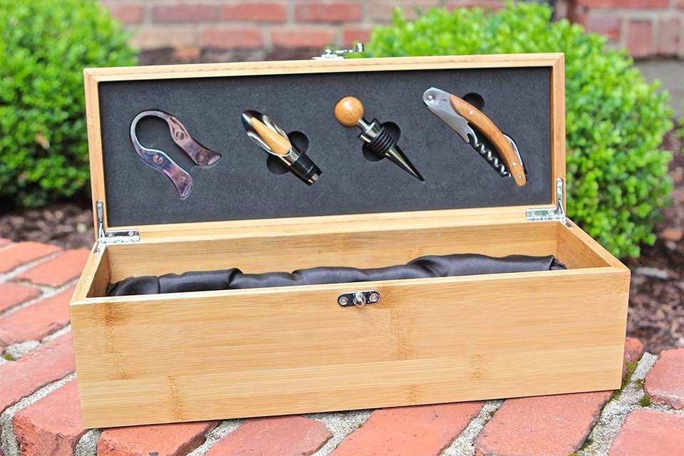 Wooden Wine Box Set | Premium Single Bottle Gift Case with Hinged Lid & Secure Clasp | Bamboo Wine Case with Tools Set | Perfect