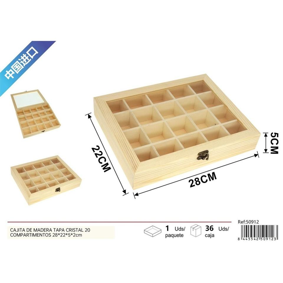Wooden box with glass lid, 20 compartments, 28x22x5x2cm for organization