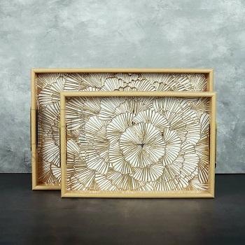 Wooden floral printed serving tray handle cuts design round shaped enamel coting glossy look