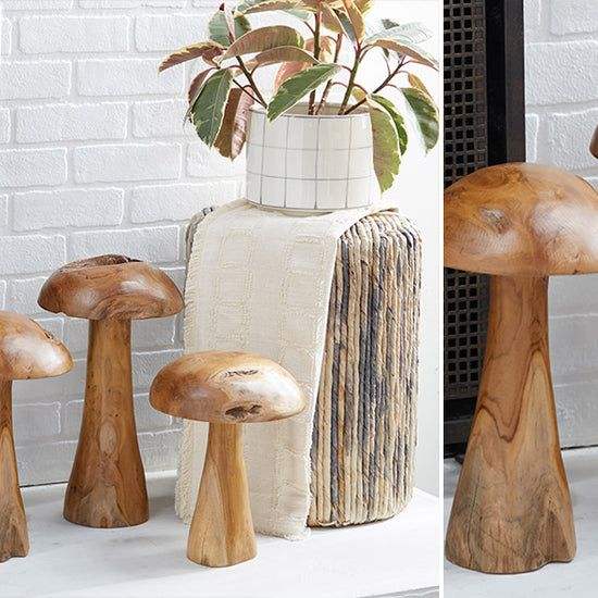 Wooden mushroom centerpiece with rustic charm and forest inspired design perfect for woodland themed dining table decor