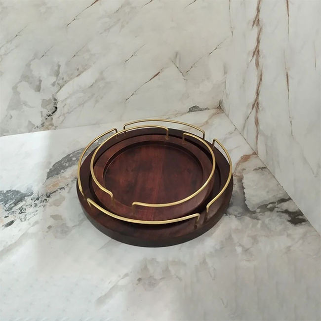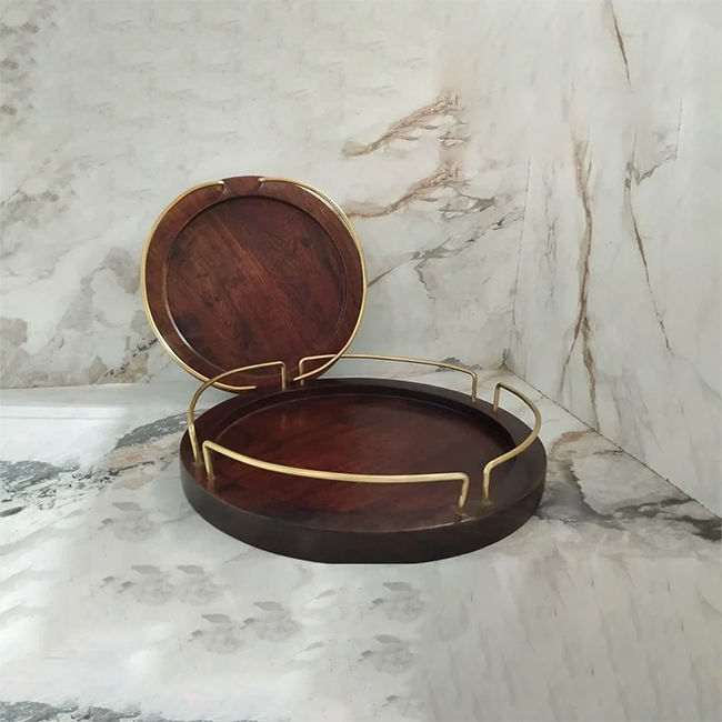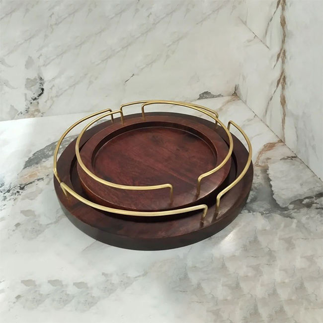 Wooden round Tray with Gold Metal Handle SET Kiln Technique for Parties