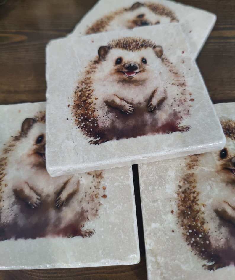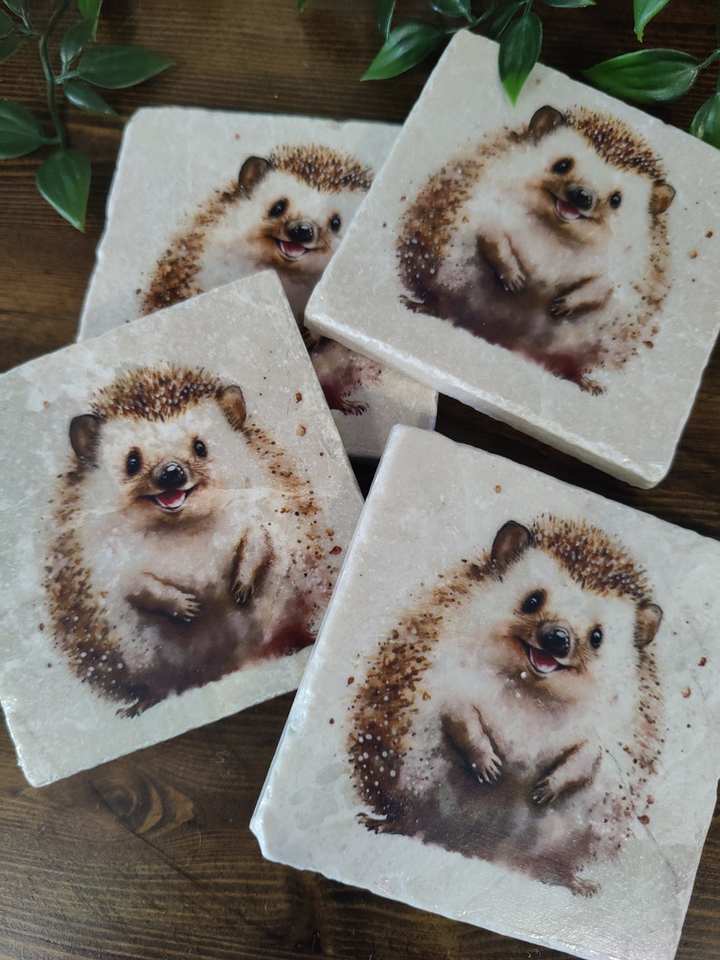 Woodland Hedgehog Marble Coasters Rustic Hedgehog Art Gift Set Coffee Table Mats