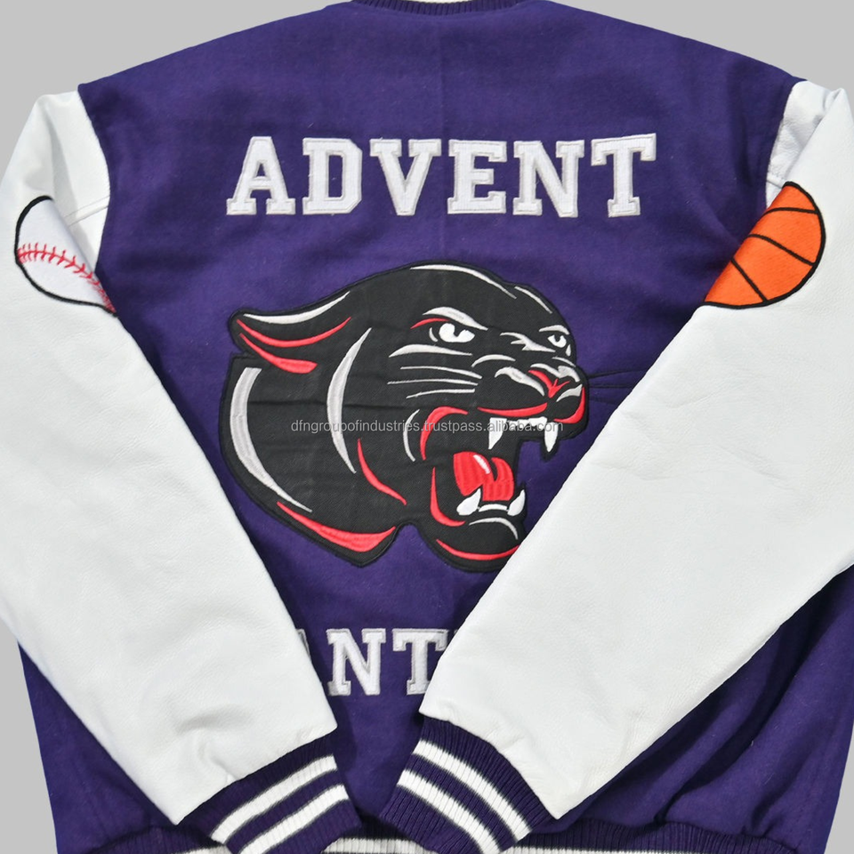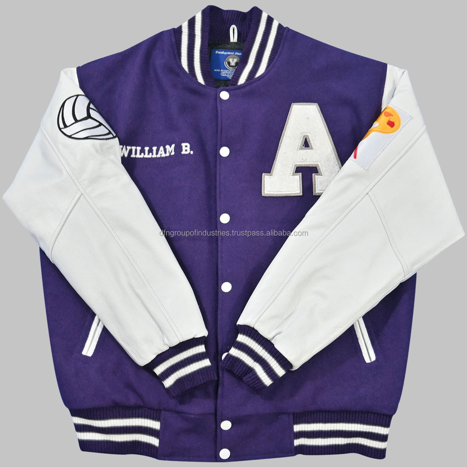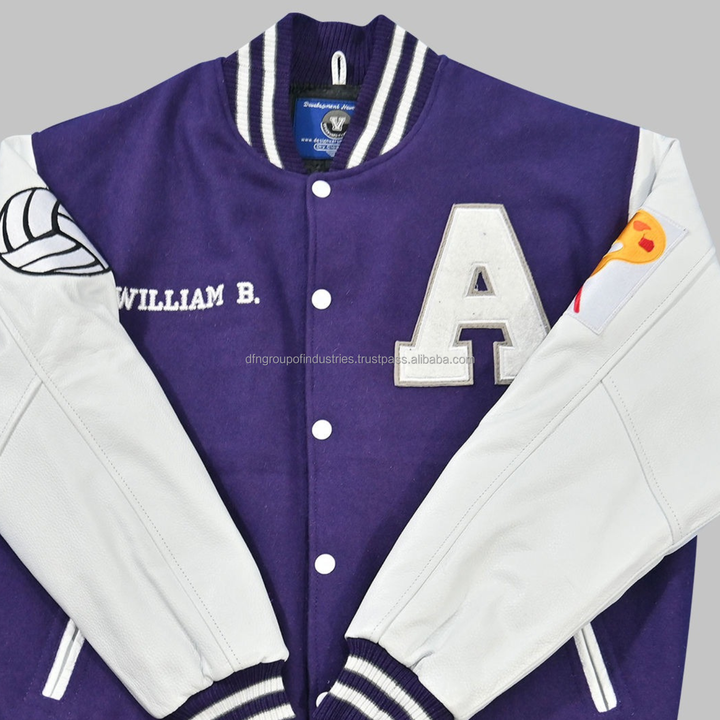 Wool Body and Genuine Cowhide Leather Sleeves Purple and White Letterman Varsity Jacket