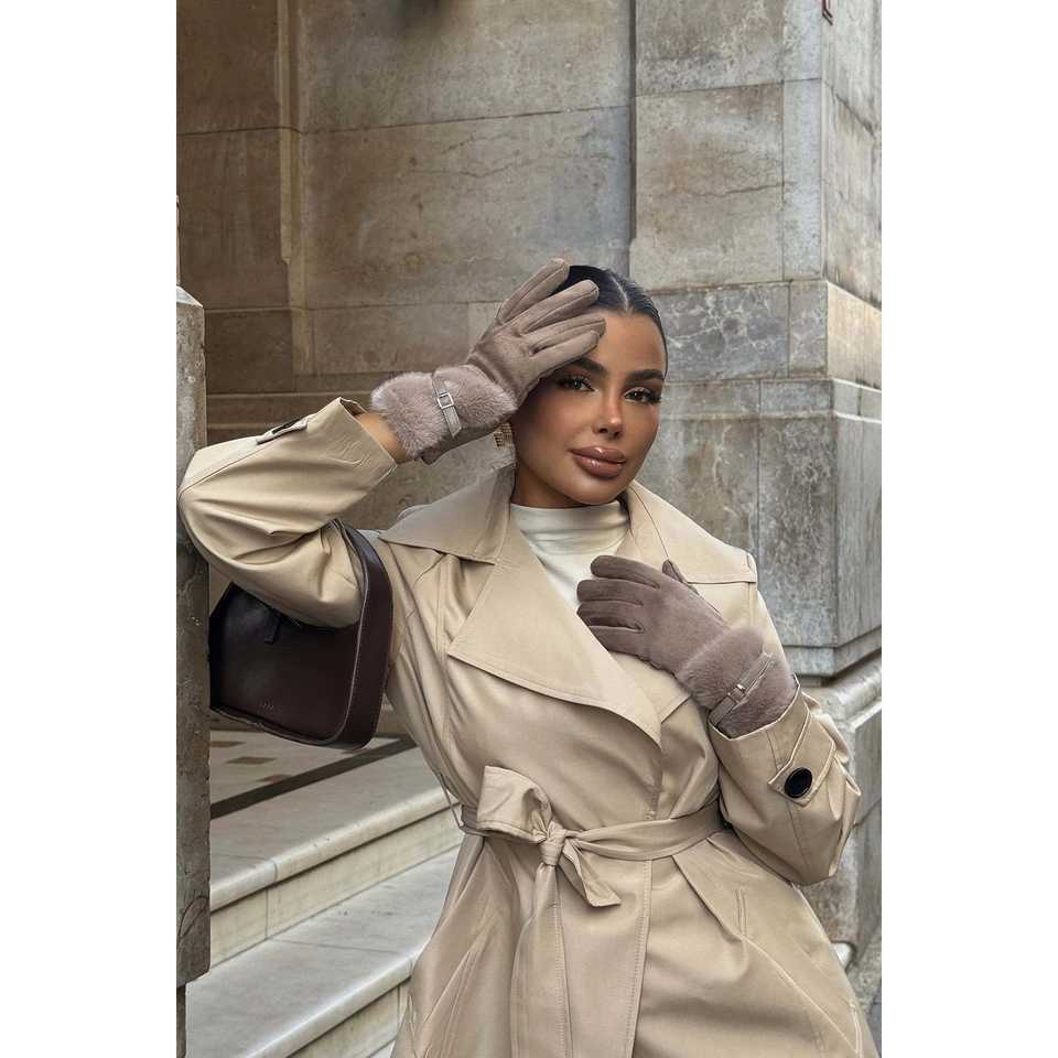 Woolen & Cashmere Cream Fur Belted Gloves & Mittens