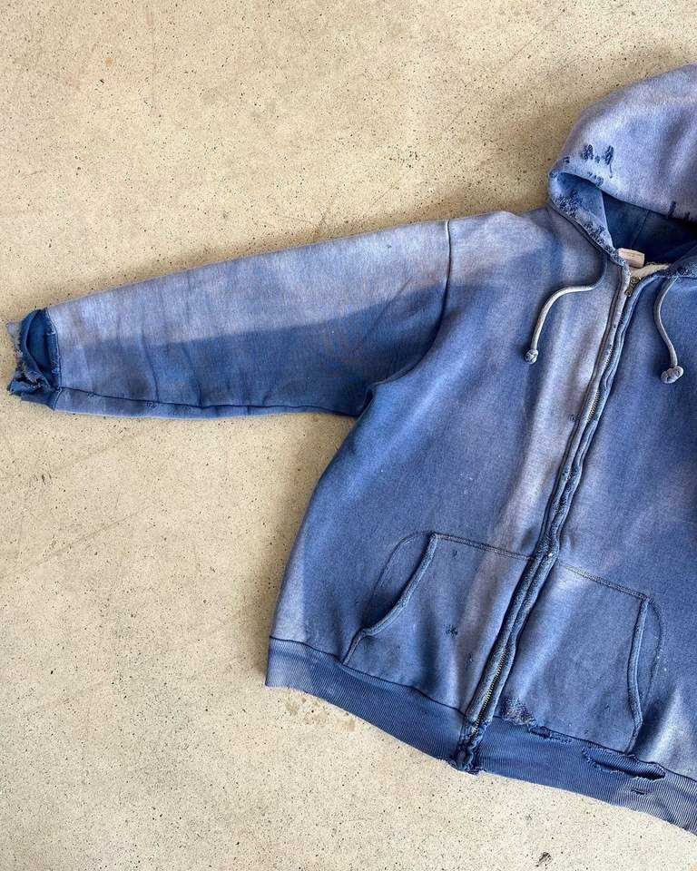 Worn Vintage Style Greek Sorority Distressed Blue Zip-Up Hoodie with Ripped Details and Faded Effect, Casual Streetwear Jacket