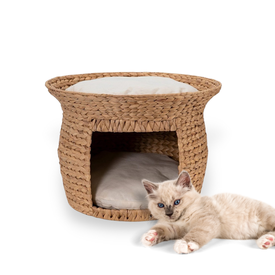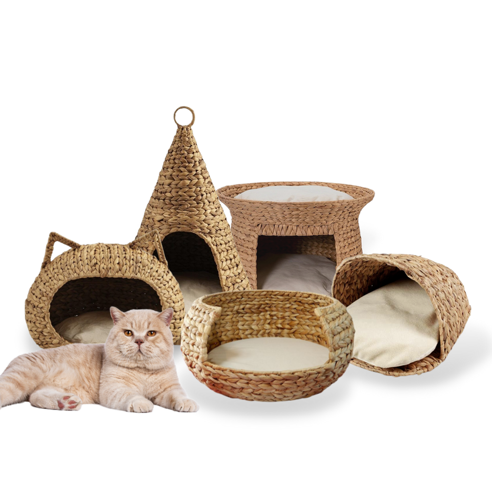 Woven Cat Playhouse for Indoor Use, Cat Scratch Bed and Tree House for Indoor Cats, Tent Shaped Woven Hyacinth Pet House