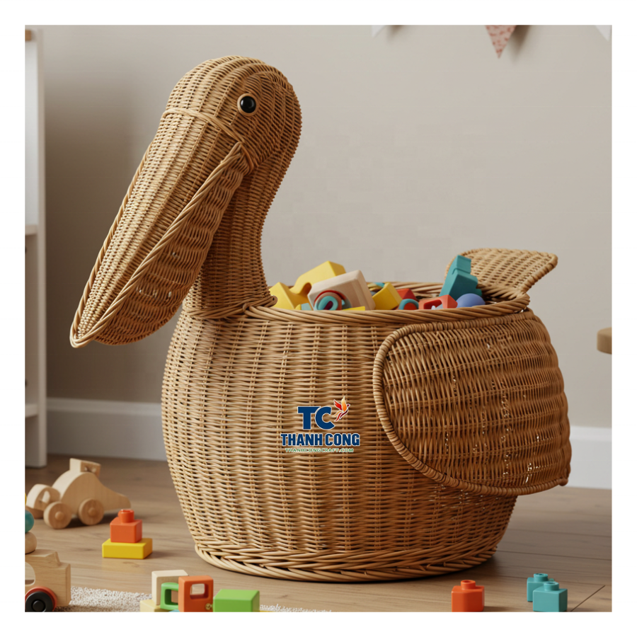 Woven PELICAN SHAPED RATTAN TOY STORAGE BASKET Whimsical And Functional Toy Bin For Kids Bedroom With Neutral Tones