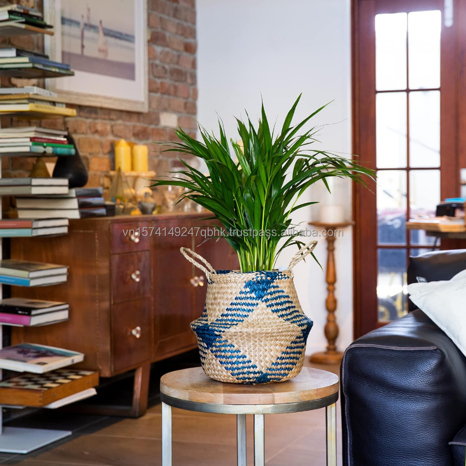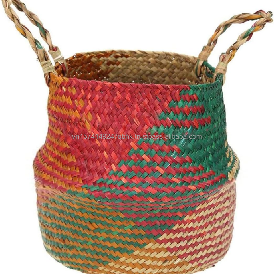 Woven Straw Belly Basket With Handles Handmade Sustainable Organizer For Plants Bathroom Or Nursery Storage Natural Foldable Use