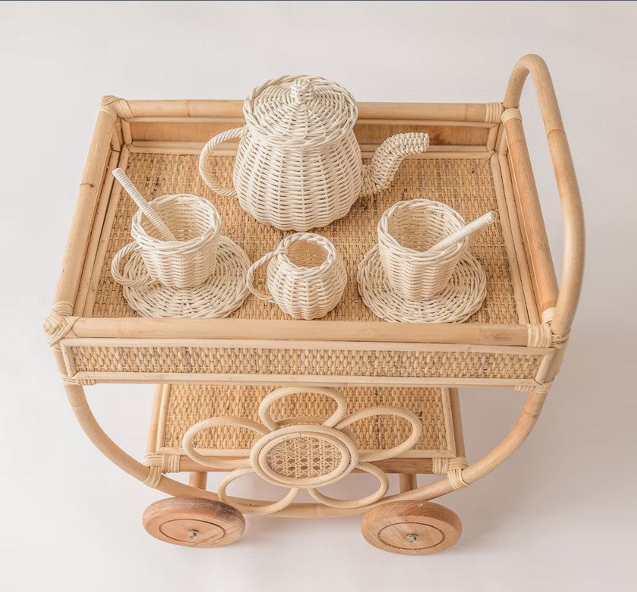Woven Tea Cart for Kids Handmade Natural Rattan Toy Stylish Montessori Pretend Play Cart Eco-Friendly Children's Toy