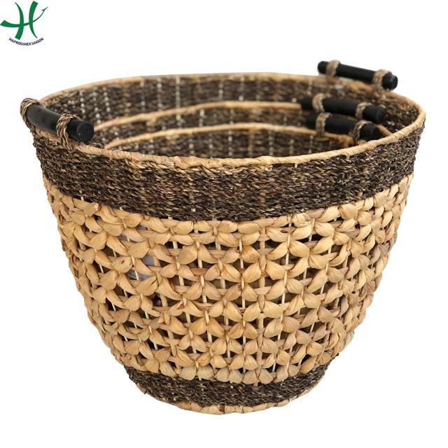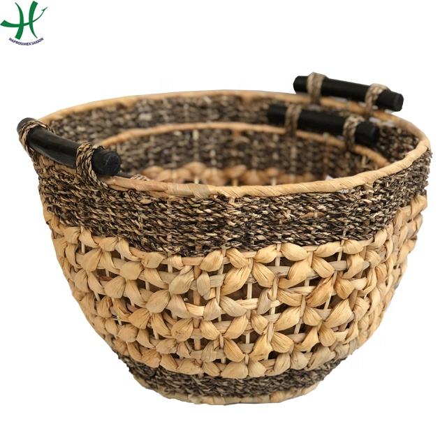 Woven Water Hyacinth Seagrass Nursery Storage Basket Wooden Handles Clothing Home Kitchen Use Oval Pattern Made Bamboo PC