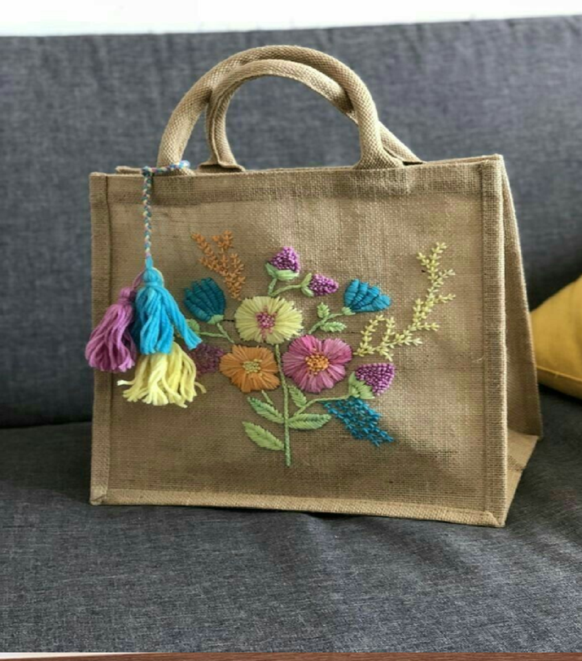 Woven straw beach tote bag with contrasting navy blue embroidered floral designs, available at wholesale prices.