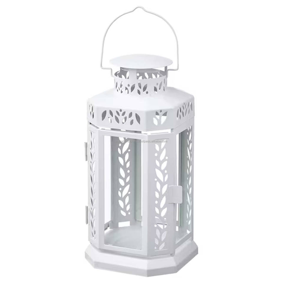 Wrought Iron Stained Glass Decorative Lantern Candle Holder Hanging Lamp Wind Lantern for Home Decor (White)