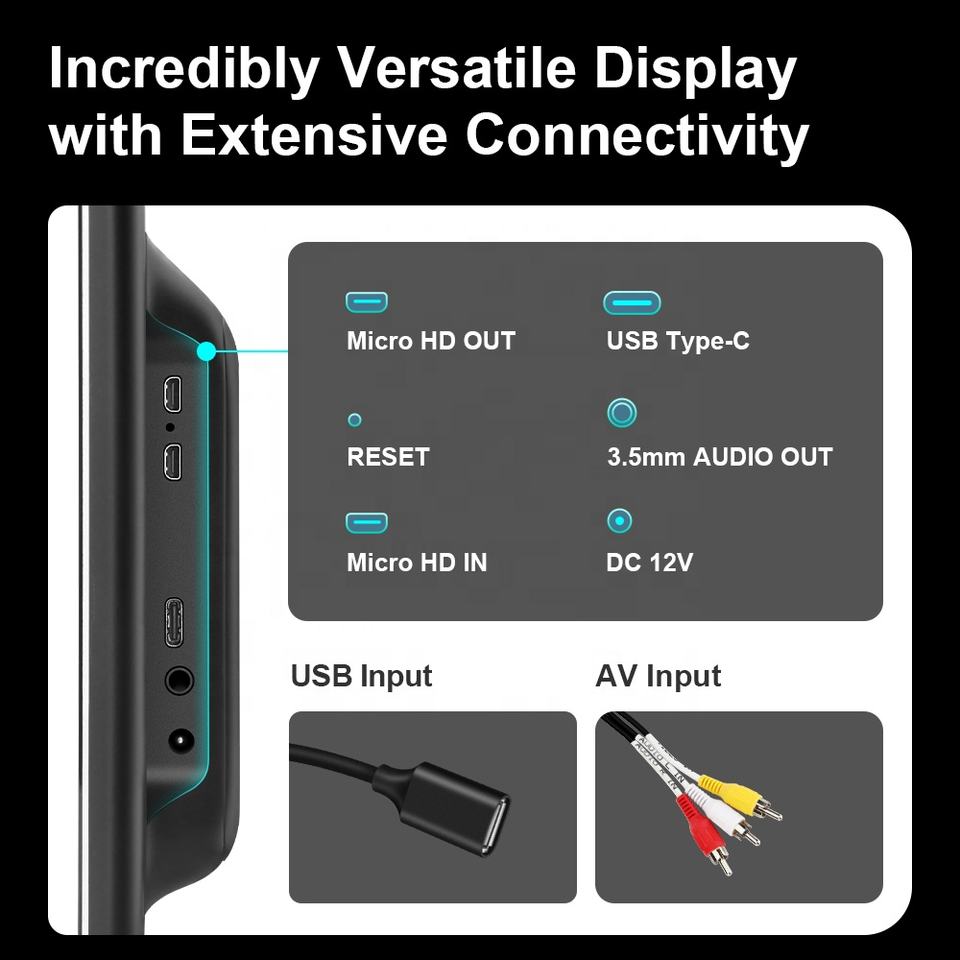 Extensive connectivity:Micro HD In & Out,USB type c,3.5mm Audio out,DC 12V,USB & AV input