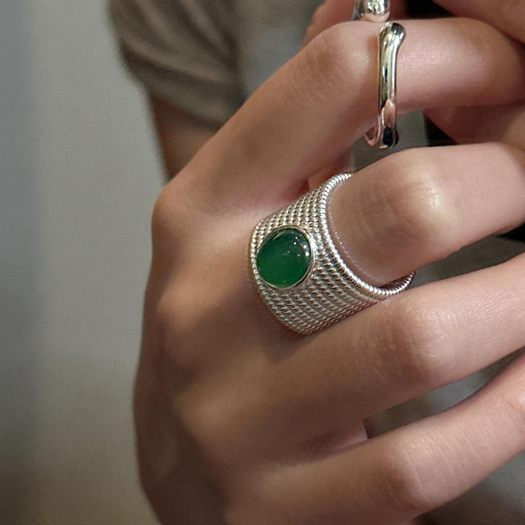 Sterling silver Hot Item S925 Sterling Silver Green Agate Wide Version Ring High-End Retro Temperament Handmade Exclusive Female