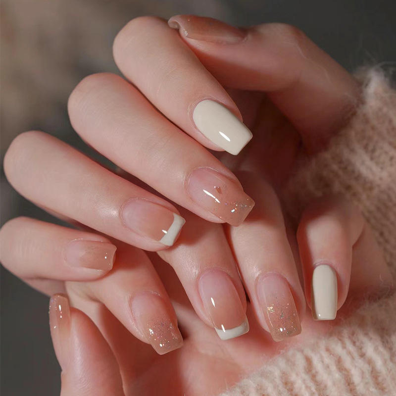 Xiaohongshu Hot-Selling Wearable Nails Color-Block Glitter French 30 Pieces Assorted Fake Nail Stickers Finished