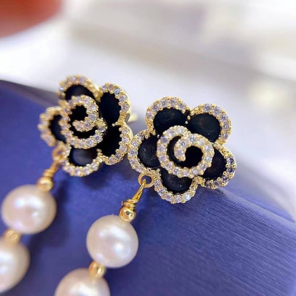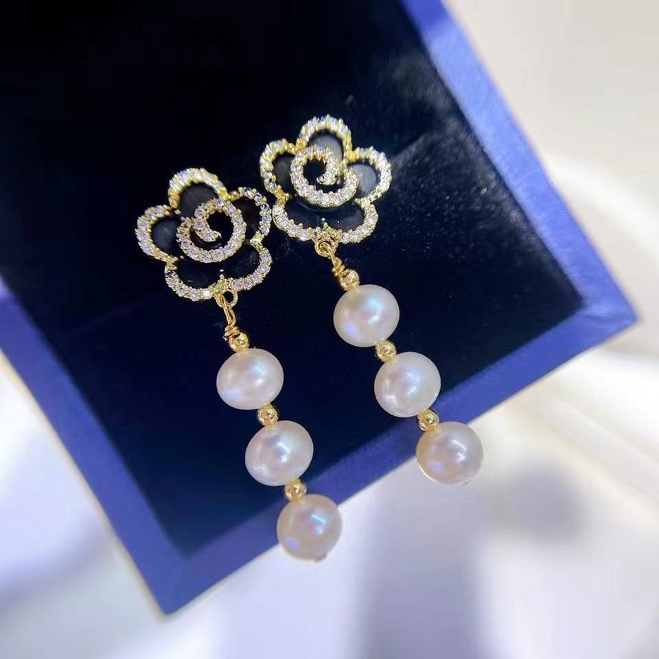 Xiaomengwu Mountain Camellia Freshwater Pearl Retro Classic Flower 6-7 Pure Silver Earpin Haoshi Inlaid Fine Dangle Earrings