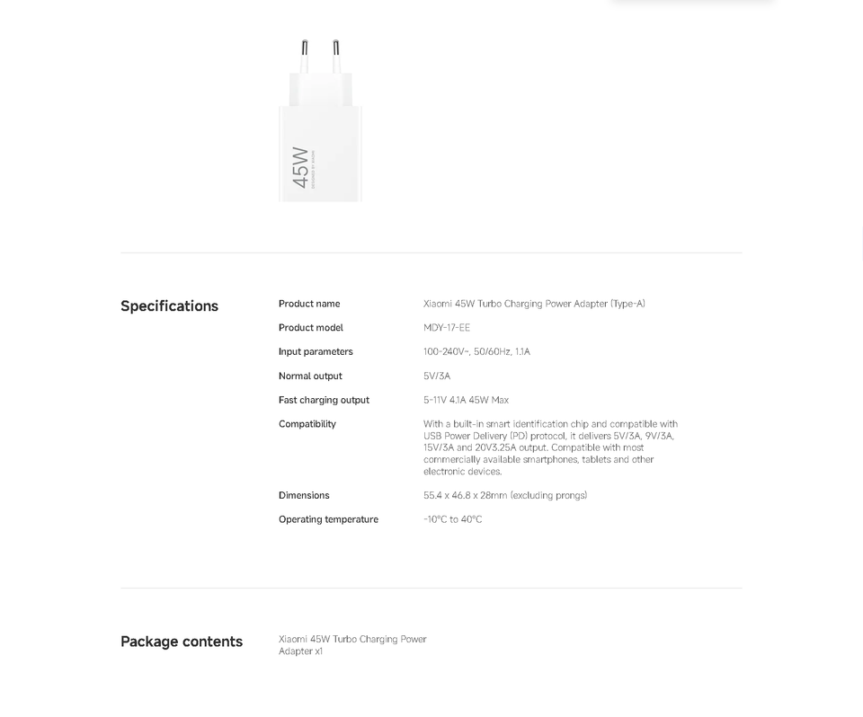 Package contents:Xiaomi 45W Turbo Charging Power Adapter x1