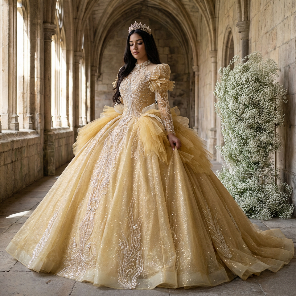 Xs231 Modern Anti-static Gold Ball Gown Quinceanera Dresses Floor-Length Mermaid/Trumpet Silhouette Applique Lace Crystal Beads