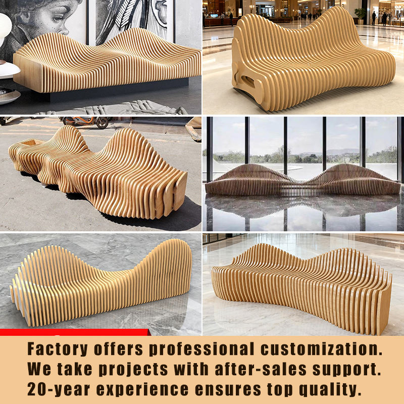 Y061 Fire Retardant Couch Fabric Weather Resistant Sculptural Wooden Bench Wave Shaped Seating Custom
