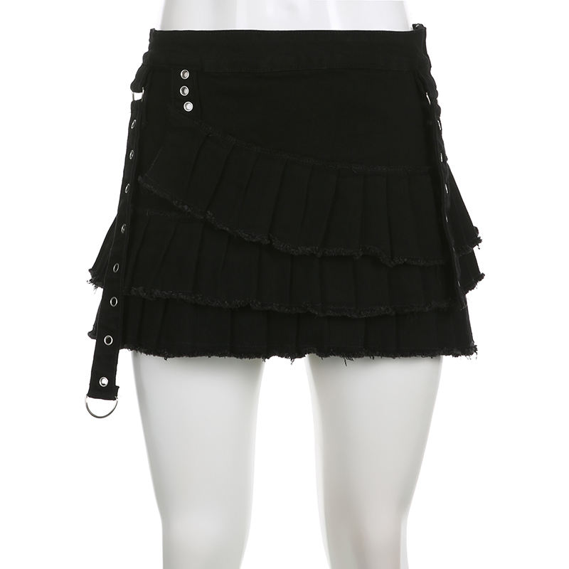 Y2K Gothic Black Tiered Ruffle Mini Skirt, Lace Up Eyelet Detail Pleated Skirt, Y2K Punk Streetwear Denim Skirt for Women