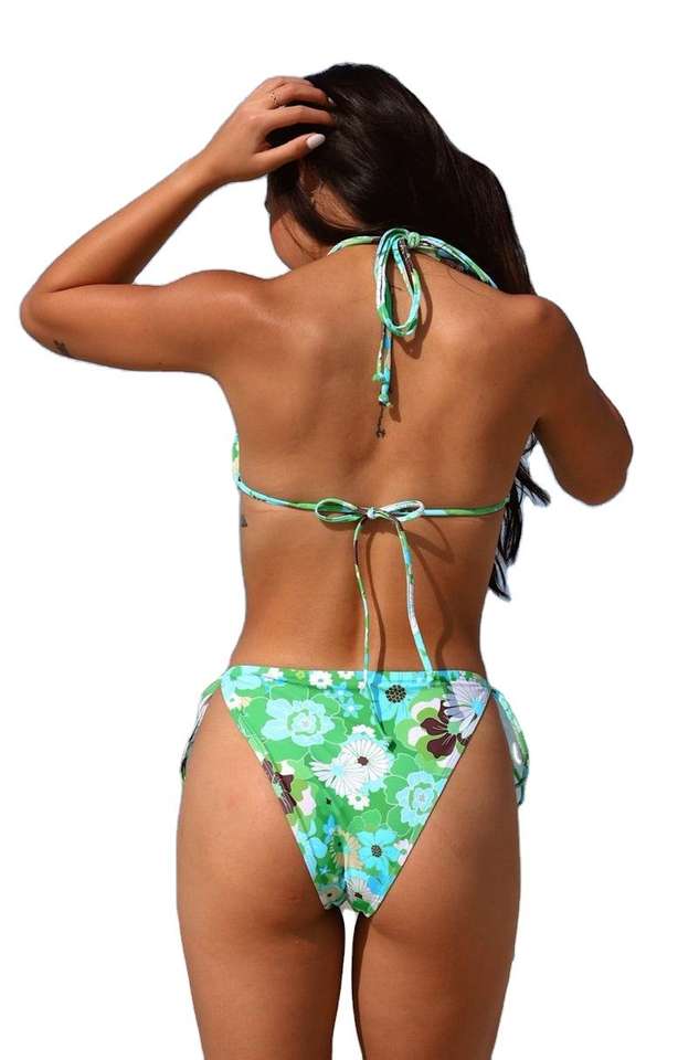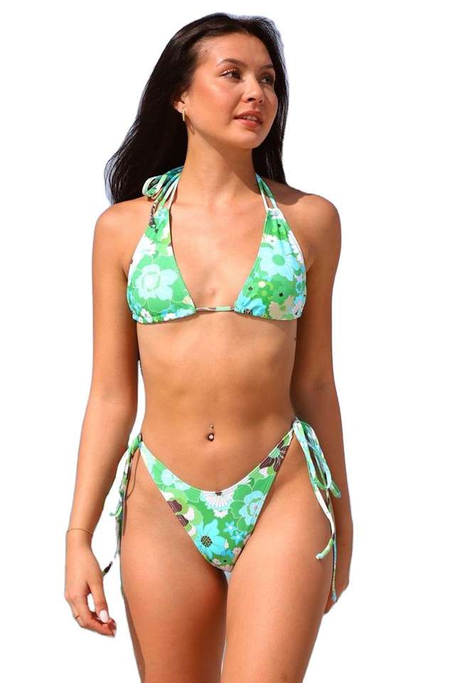 Y2K Retro Floral Tie Side Plus Size Micro Bikini Set Custom Women's Swimwear Front Logo Green Vintage Print Triangle Beachwear