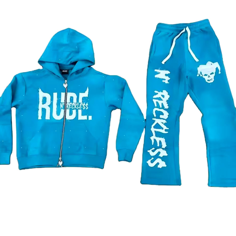 Y2K Style Graphic Screen Print Distressed Vintage Track Suit 2 Pieces Hoodie and Flare Sweatpants Sets Tracksuit