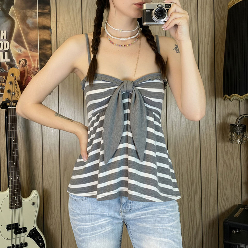 Y2K Sweet Edgy Bow Tie Strap Striped Knitted Camisole | Adjustable Slim-Fit Spaghetti Strap Tank Top for Women