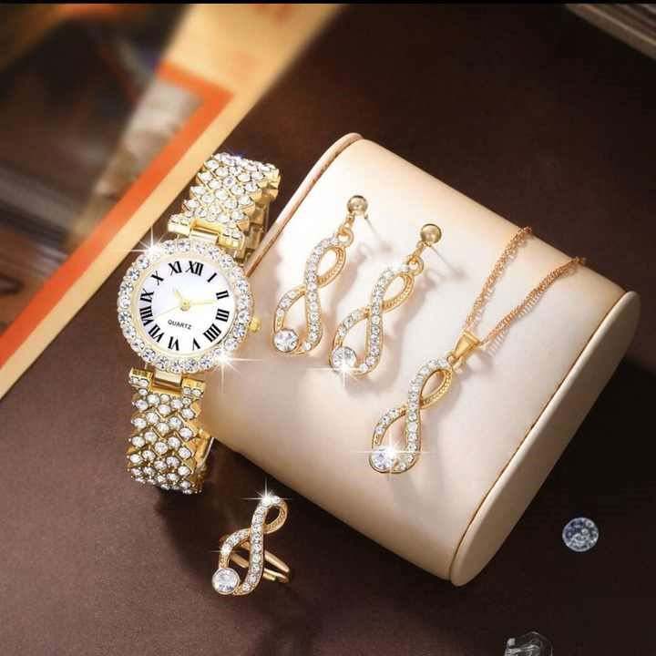 Y856 Ladies Quartz Watch 5pcs Hip Hop Rhinestone Jewelry Women Necklace Ring Earrings Gifts Jewelry Set