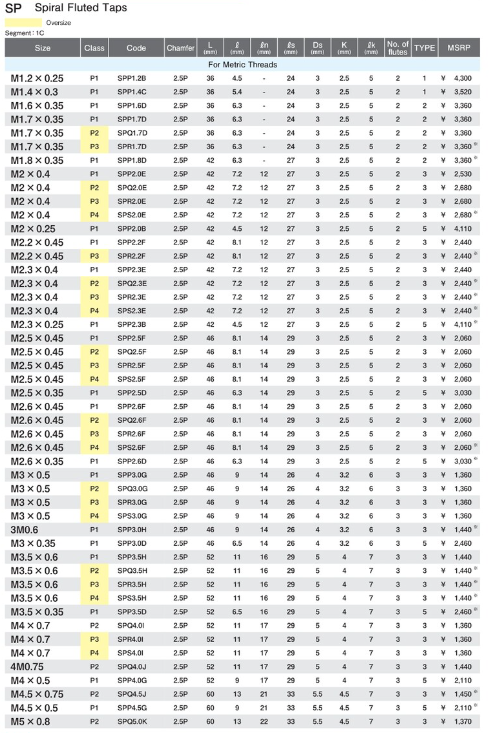 YAMAWA SP Spiral Fluted Tap for blind hole HSS M1.2-22 for low-speed machining on drilling machine and machining centers